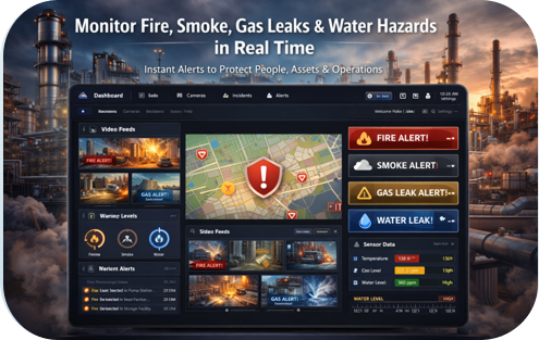 Monitor fire, smoke, gas leaks, and water hazards in real time, sending instant alerts to protect people, assets, and operations
